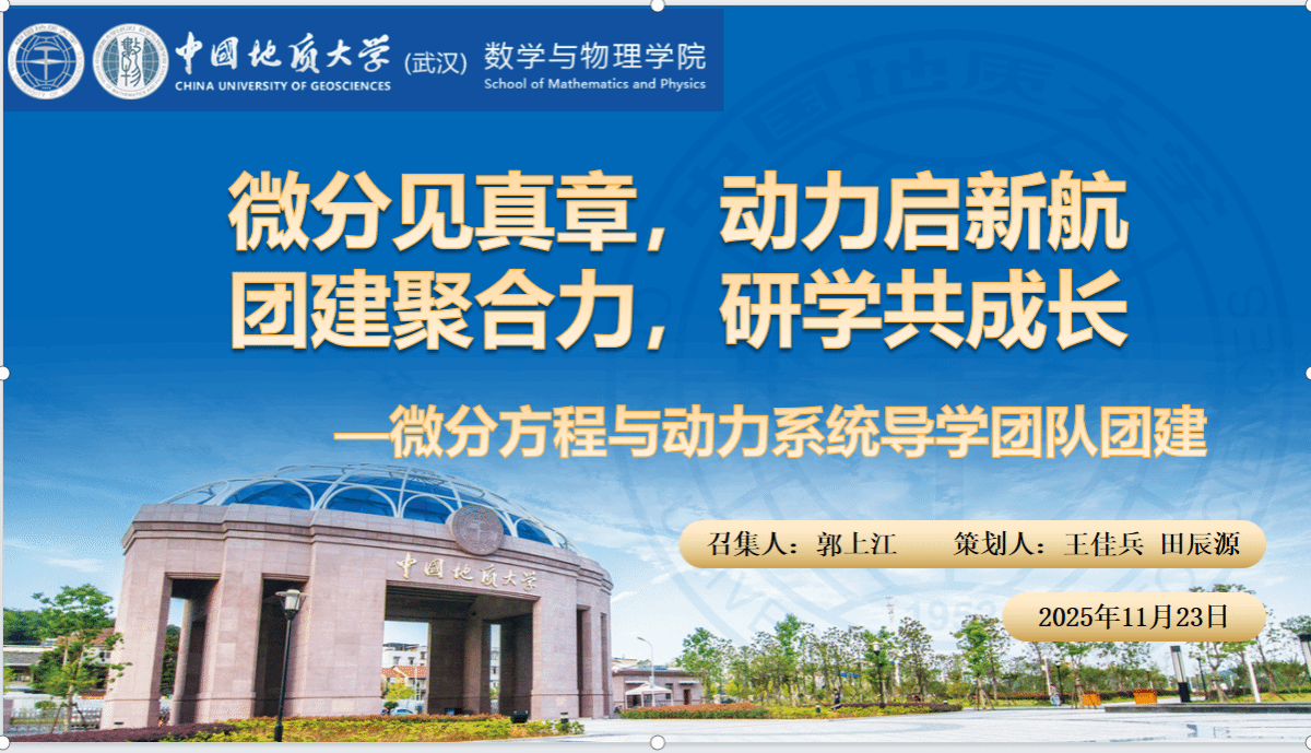 在象牙塔的学术探索中,他们是深耕微分方程、攻坚动力系统的科研同行;在烟火气的生活图景里,他们是畅谈理想、共享时光的良师益友。2025年11月23日,初冬暖阳驱散寒意,天光温柔铺洒大地,beat365在线唯一官网“微分方程与动力系统”导学团队以“严谨学术与轻松生活”为主题,赴一场兼具深度与温度的团建之约。从思维交锋的学术汇报到自在惬意的休闲时光,这场活动让理性的科研精神与鲜活的生活气息双向奔赴,为团队注入了更深厚的凝聚力与向心力。