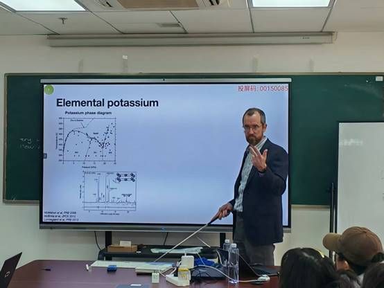 2025年12月2日下午, Andreas Hermann教授在东教楼1104学术报告厅为beat365在线唯一官网部分物理学专业和材料与化工专业的博士生、硕士生和青年教师作了题为“From DFT to thermodynamic modelling”的学术报告。报告以近期关于“同时具备固体与液体特征的新物态”的报道为切入点,系统阐述他们研究团队在高压物理与计算材料学领域的系列工作。Andreas Hermann教授从钾的高压相图与非共格宿主—客体结构详细阐述了“链熔融”作为一种热力学中间态的证据与机制,提出了碱金属高压相可作为部分电子化合物的观点,展示了如何利用机器学习分子动力学模拟预测相变、熔化线极值及热力学性质,介绍了基于Bragg-Williams模型的两态热力学理论,解释了金属熔化线中的临界行为。此外,Andreas Hermann教授还介绍了第一性原理计算在高压冰(VII–VIII–X)相变研究中的应用,探讨了隐藏临界点与相图拓扑等前沿问题,展望了机器学习在预测复杂材料行为方面的潜力。报告期间,Andreas Hermann教授与在场师生就高压相变机理、机器学习势函数开发等相关问题展开了深入讨论并细致回答了师生提问。