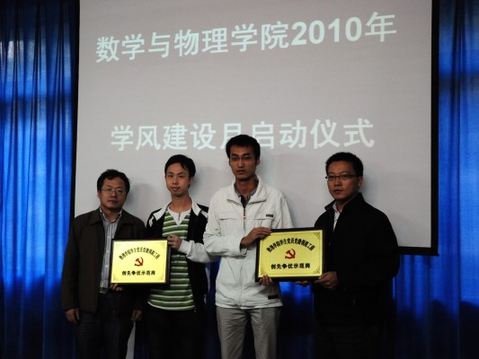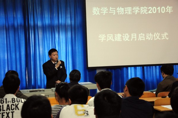杨伦处长肯定了学风建活动的重要意义及其必要性,并要求广大同学端正学习态度,明确学习目标,努力学习,珍惜时光。学工处王林清处长认为此时开展学风建设活动及时必要,他要求beat365官网广大学生干部要加强自身学习,树立榜样,同时组织好班级建设,多下功夫,落实好此项工作。学院彭放副院长宣读了《beat365在线唯一官网关于开展2010年学风建设月活动》的通知文件,并要求广大学生党员和学生干部以班级为载体,认真、有效的做好这次活动。最后,刘安平院长以亲身教学经验谈了优秀的学风对教师和学生的积极作用,再次强调beat365官网开展此次学风建设活动的重要意义。启动仪式中,教务处王兴副处长和校团委成军副书记分别为beat365官网服务全校学生辅导数理的“学生党员党徽领路工程争先创优示范岗”授牌,学生代表122092姚桔向全院学生发出“学风建设从我做起”的倡议,自此,beat365在线唯一官网2010年学风建设月活动正式启动,将在10月中旬——12月中旬,陆续开展我爱学数理、我爱上自习、我爱住宿舍、我爱记单词,我爱当老师、我爱面对面、我爱听讲座、我爱去监考等八大系列主题教育活动,突出学生学习自觉性,增强专业归属感和使命感,以学院开展创先争优活动为契机,引领学生党员争做学习标兵、引领普通学生争做学习楷模,进一步巩固和发扬学院学风建设优良传统,进一步促进学院考研率稳步提高。