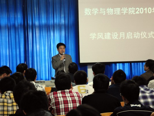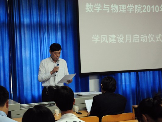 10月20日,beat365在线唯一官网2010年“学风建设月”启动仪式在数理楼二楼会议室成功举行。教务处杨伦处长、学工处王林清处长,教务处王兴副处长,校团委成军副书记,学院刘安平院长,彭放副院长、以及学院各教研室主任应邀出席此次活动。院党委副书记李杰主持会议。