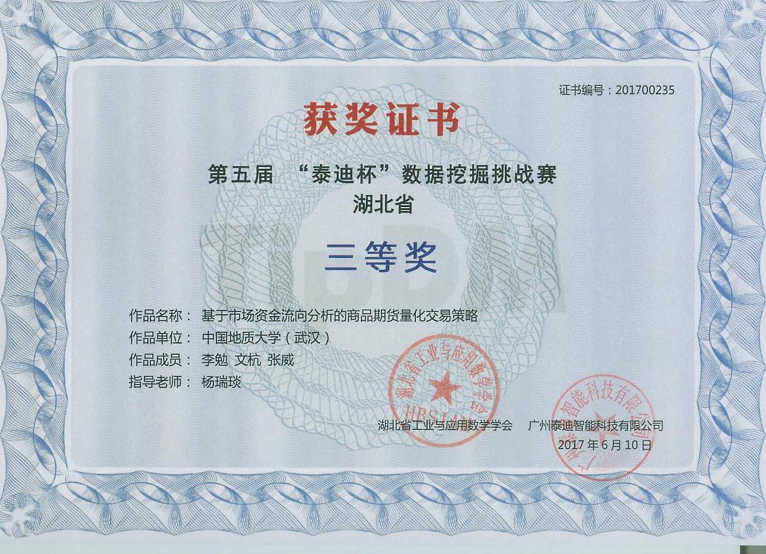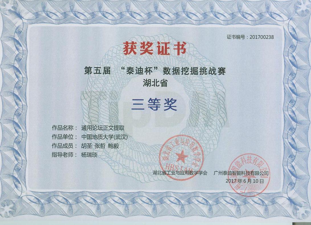 据“泰迪杯”数据挖掘挑战赛组委会近日公布的结果,在2017“泰迪杯”竞赛活动中,我校第一次参加此项活动,在3支代表队中获得湖北省三等奖2项的好成绩。