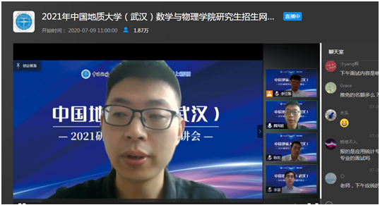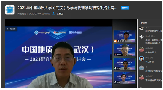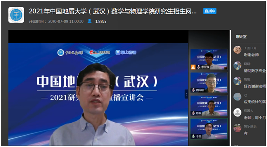 7月9日上午,beat365在线唯一官网副院长魏周超、物理系主任陈欢、信息与计算科学系主任李星通过中国教学在线网络直播平台,向同学们介绍了beat365在线唯一官网数学、物理、应用统计三个研究生招生学科的基本情况,并回答了同学们提出的各种问题。据统计,直播结束时,有大约1.8万余人参与了本次直播活动。