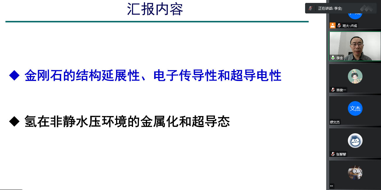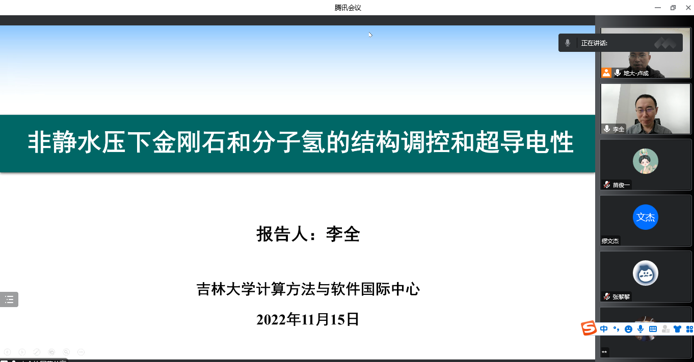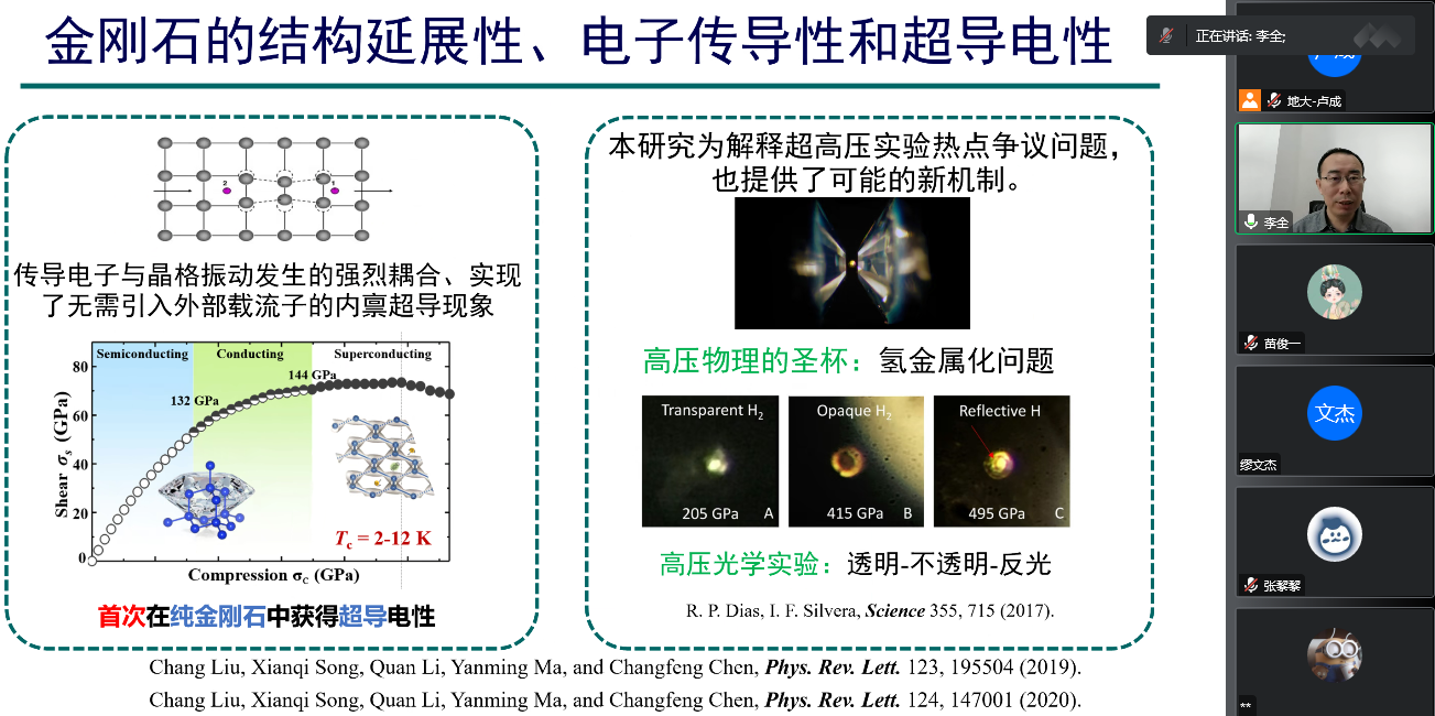 为迎接我校七十周年校庆,11月15日上午,beat365在线唯一官网通过线上的方式,邀请吉林大学计算方法与软件国际中心李全教授,为我校物理系师生做了题为《非静水压下金刚石和分子氢的结构调控和超导电性》的学术报告。该报告由我校科学技术发展院、beat365在线唯一官网联合举办,卢成教授主持,本院师生共计60余人参加。