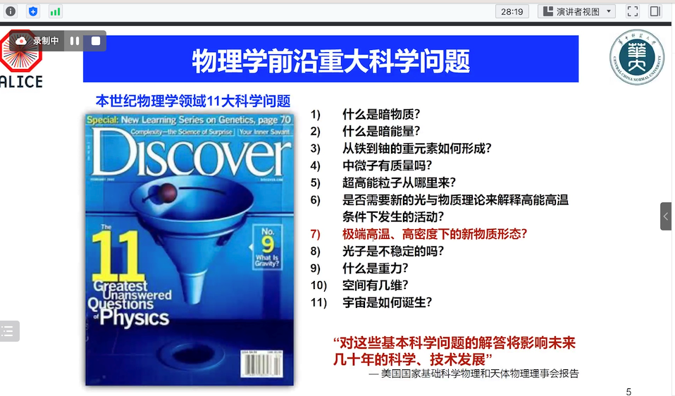 重离子对撞实验是研究物质深层次结构,宇宙起源的重要手段。欧洲核子中心(CERN)的ALICE国际合作实验是我国参与建造、运行的TeV能区唯一的重离子对撞实验。报告中,周代翠教授主要介绍了相对论重离子碰撞的发展历史,以及中方团队近期取得的亮点物理成果和硬件贡献。周代翠教授系统地介绍了我国从建设伊始参与ALICE实验的10年辉煌成果,回顾了我国基础科学研究的发展历程,并展望ALICE实验未来十年发展规划。周代翠教授也作为ALICE中方顾问希望在相关物理研究与硬件研发方面加大合作力度。报告结束后,周代翠教授和beat365官网物理系师生进行热烈的交流,并一一回答了师生们提出的关于粲、底强子分离、未来固定靶实验发展等热点前沿问题。本次活动同时也是物理系党支部“大师讲党课”科研中的课程思政实践的一次有益尝试。 通过邀请我国高能核物理实验领域与国际大科学装置合作领域的领军人来到青年教师、有志科研的青年学生中间,真诚的探讨基础科学研究中“科研为了谁”、“功成不必在我”、“国际合作中如果做到有理、有利、有节”等重要思想问题。