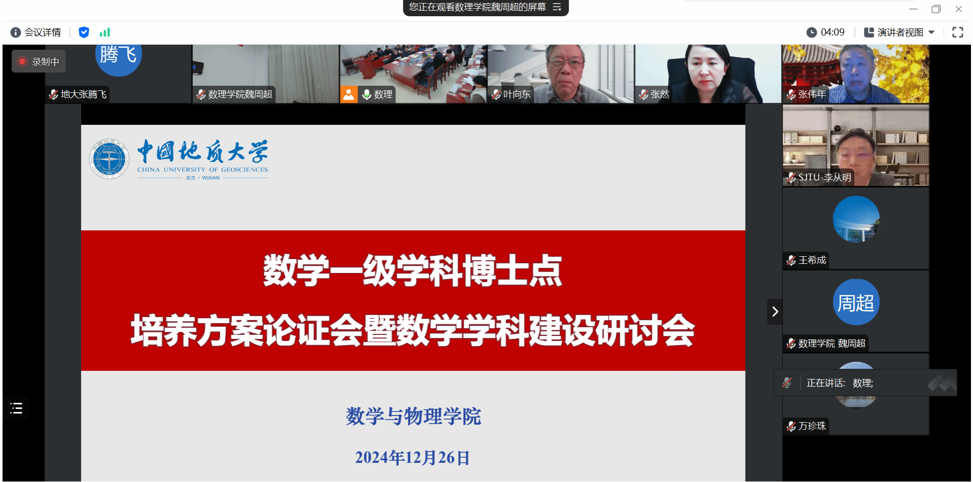 本次会议邀请了中国科学院院士、中国科学技术大学叶向东教授,吉林大学张然教授,上海交通大学李从明教授,四川大学张伟年教授,武汉大学赵会江教授等国务院学位委员会第八届数学学科评议组成员,以及武汉大学杨彤教授和华中科技大学刘斌教授,专家们通过线上线下参会方式对我校数学一级学科博士点培养方案和数学学科建设进行指导。