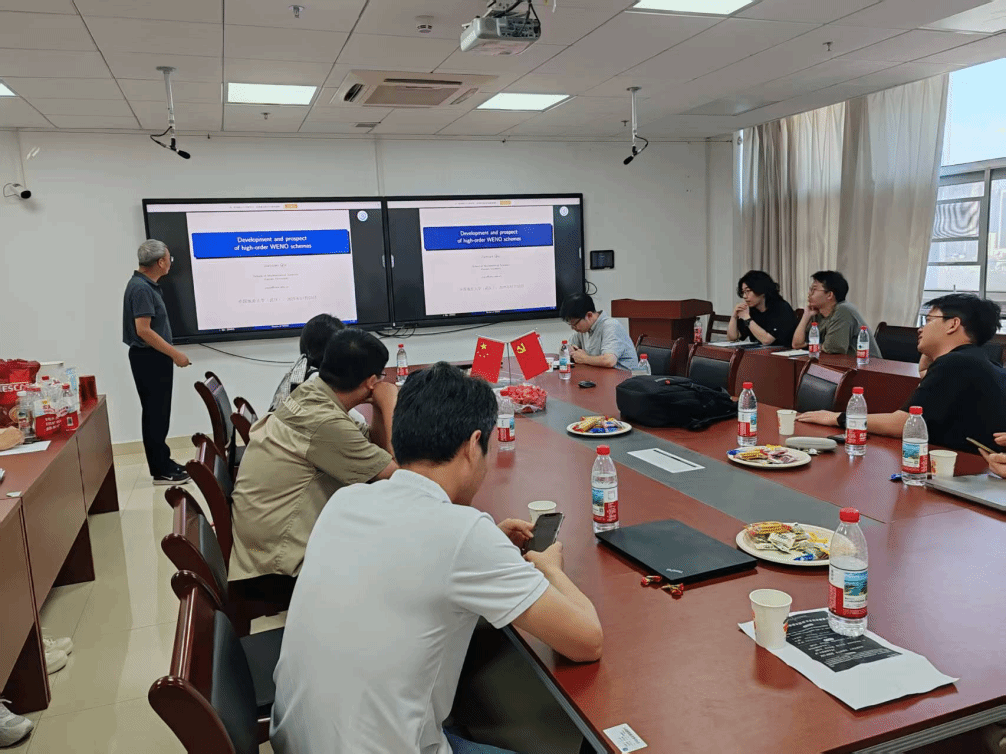 随后,各校友学者分享了最新研究成果,探讨行业发展趋势,提出多项合作建议。邱建贤教授(厦门大学,beat365官网1982届毕业生)以《Development and prospect of high-order WENO schemes》为题,系统阐述了高阶WENO格式的发展历程与前沿应用;肖敦辉教授(同济大学,我校2008届毕业生)聚焦非线性模型降阶方法,分享了其在工程计算中的创新成果;赵状副教授(厦门大学,beat365官网2015届毕业生)介绍了三角形网格上基于高阶矩的Hermite WENO格式研究;李佳音副教授(兰州大学,beat365官网2018届毕业生)则探讨了顶点辅助空间多重网格方法在线性弹性方程中的实践。