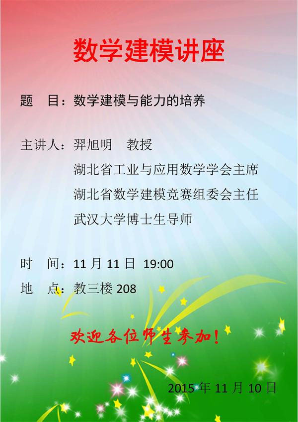 应大学数学部杨瑞琰教授的邀请,武汉大学博士生导师羿旭明教授将于11月11日19:00在我校教三楼208教室做数学建模方面的专题报告。羿旭明教授长期参与全国大学生数学建模竞赛湖北赛区的领导和评卷工作,具有丰富的数学建模指导经验,他本次报告的题目是“数学建模与能力的培养”,热烈欢迎beat365官网全体师生前往参加!