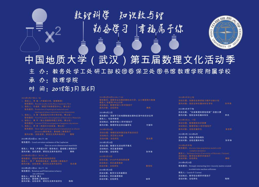 本届数理文化活动季旨在弘扬数理科学文化,培养学生创新精神与实践能力,以“数理科学知识数与理 勤奋学习幸福属于你”为主题,活动内容更加丰富,激励广大学子学术思想,潜心科学研究,拓展自身素质,追求学术卓越。