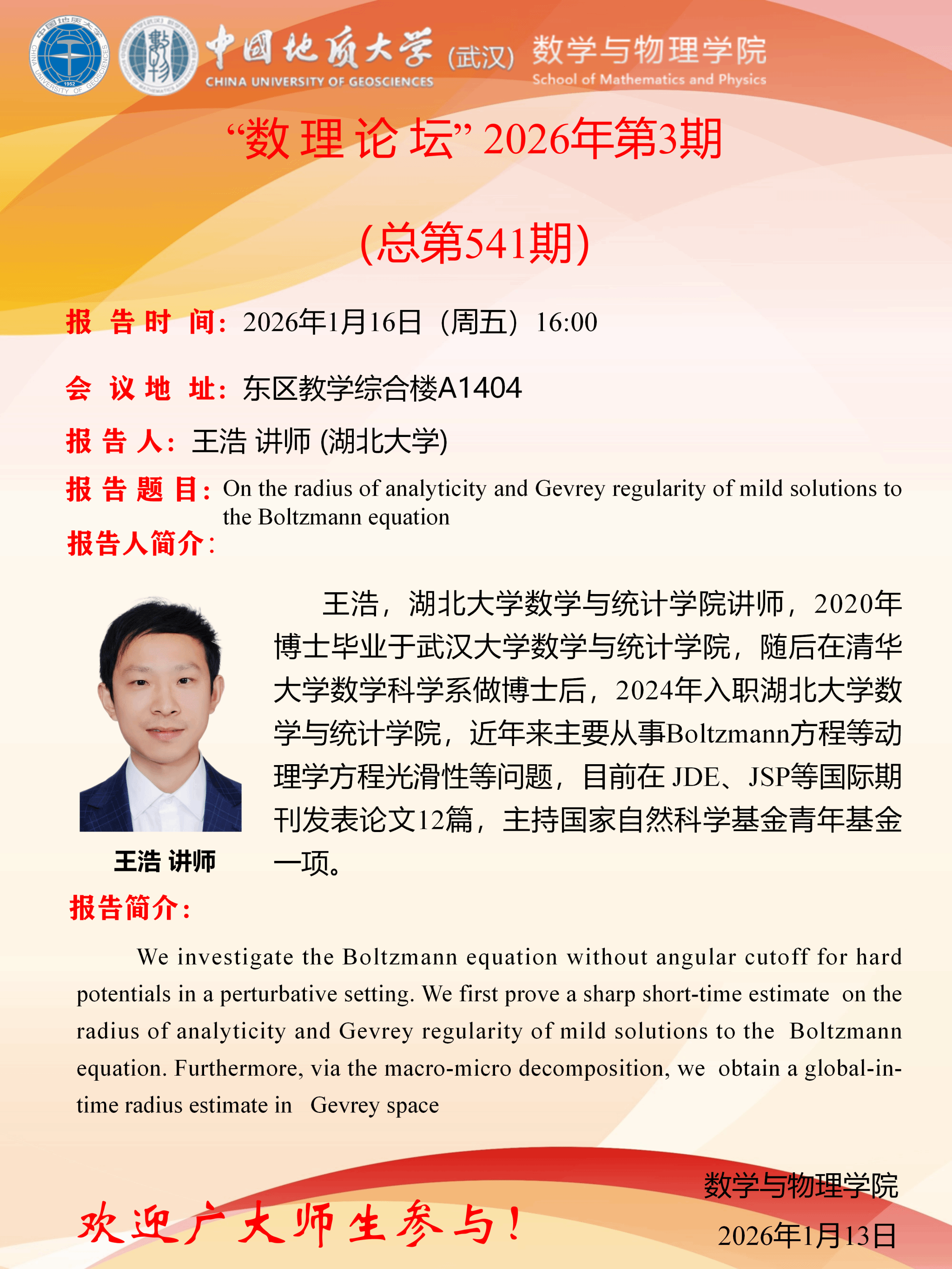 2026年1月16日王浩学术讲座:On the radius of analyticity and Gevrey regularity of mild solutions to the Boltzmann equation