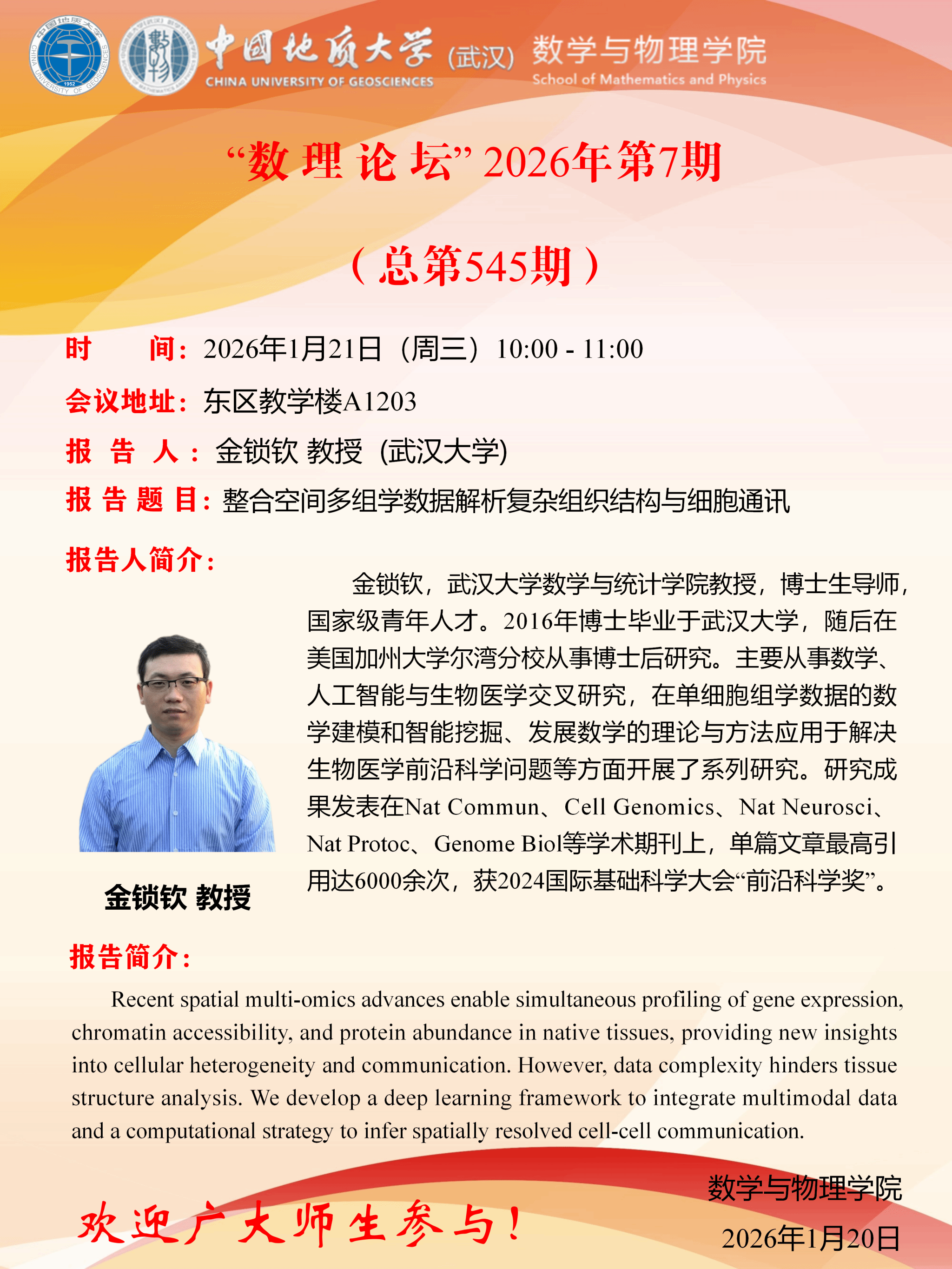 2026年1月21日金锁钦授学术讲座:整合空间多组学数据解析复杂组织结构与细胞通讯