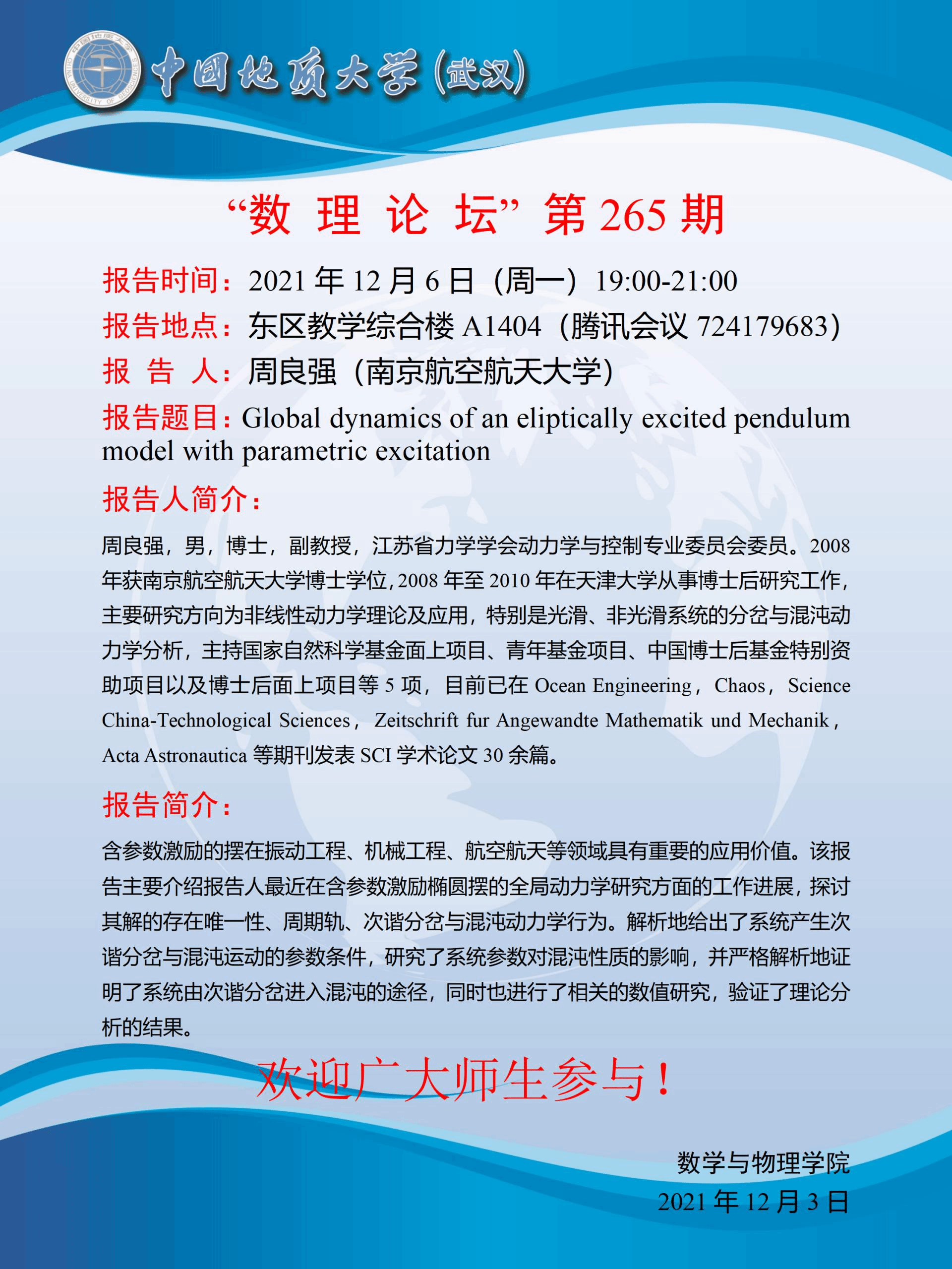 "数理论坛"第265期:Global dynamics of an eliptically excited pendulum model with parametric excitation