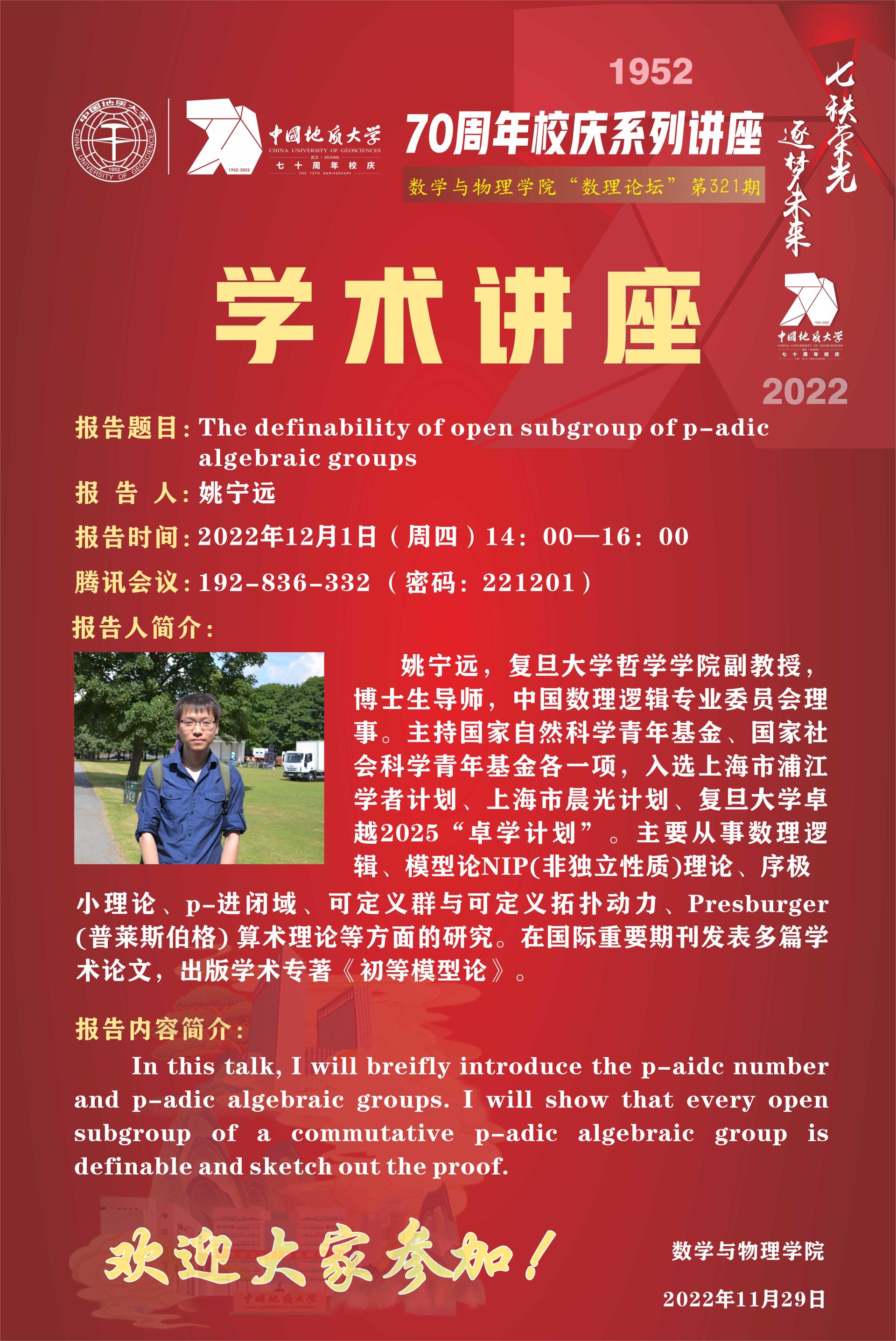 "数理论坛"第321期:The definability of open subgroup of p-adic algebraic groups
