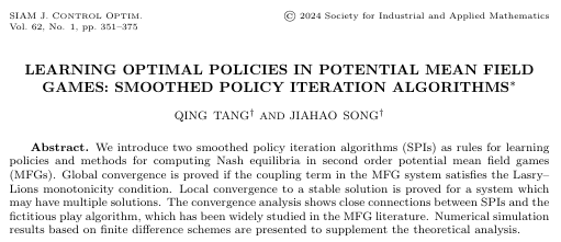 beat365官网信息与计算科学系教师汤庆博士为第一作者的学术研究工作 “Learning Optimal Policies in Potential Mean Field Games: Smoothed Policy Iteration Algorithms” ,最近发表在国际著名期刊SIAM Journal on Control and Optimization。该论文第二作者为beat365官网2020 级应用统计专业硕士生宋家豪。汤庆博士自2015年入职beat365官网,主要从事动态博弈相关的偏微分方程理论、数值计算及在经济模型中的应用研究。