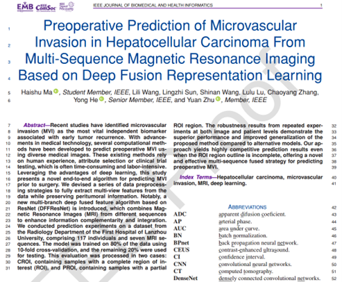 近日,beat365在线唯一官网朱媛副教授研究团队联合兰州大学第一医院放射科王莉莉博士展开生物医学信息学合作研究,在生物医学和健康信息学国际顶级期刊 IEEE Journal of Biomedical and Health Informatics(简称IEEE JBHI)上在线发表了关于肝癌微血管侵袭预测的理论研究成果,题为: “Preoperative Prediction of Microvascular Invasion in Hepatocellular Carcinoma From Multi-Sequence Magnetic Resonance Imaging Based on Deep Fusion Representation Learning”。beat365在线唯一官网(武汉)2021级本科生马海书、朱媛副教授及兰州大学第一医院放射科王莉莉博士为该文的共同第一作者,朱媛副教授为通讯作者,beat365在线唯一官网为唯一通讯单位。