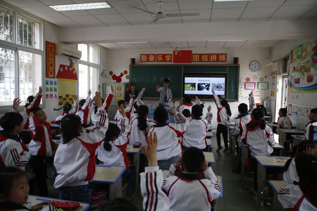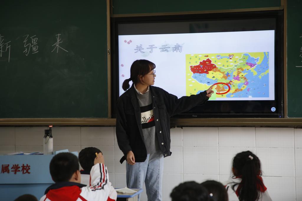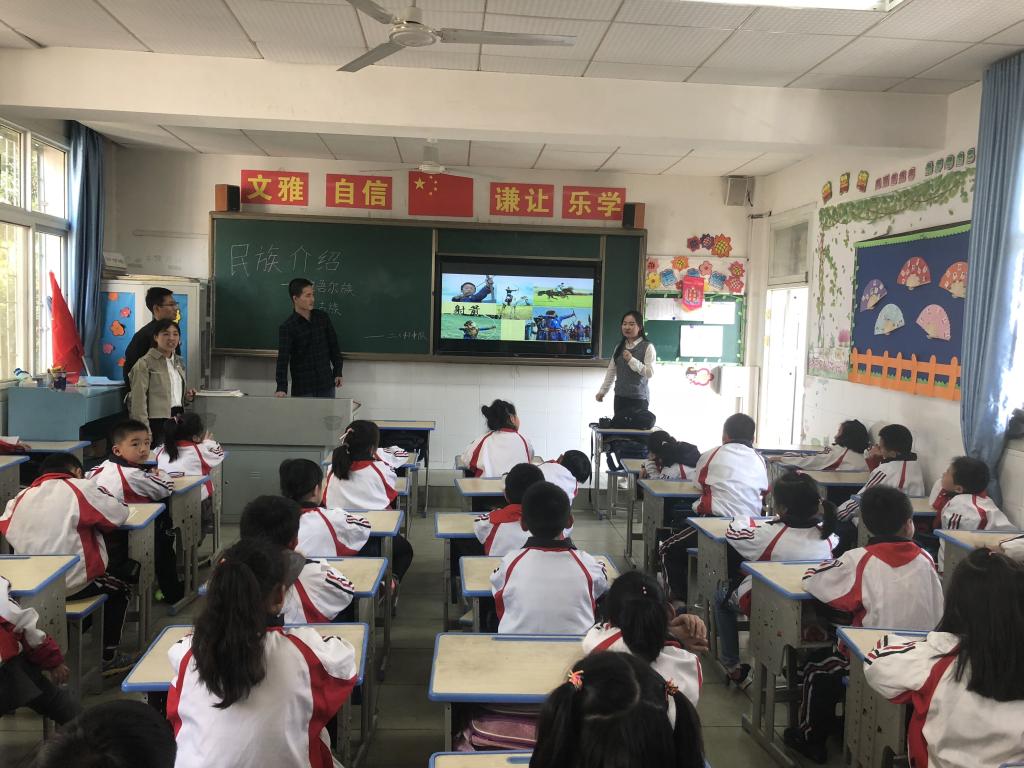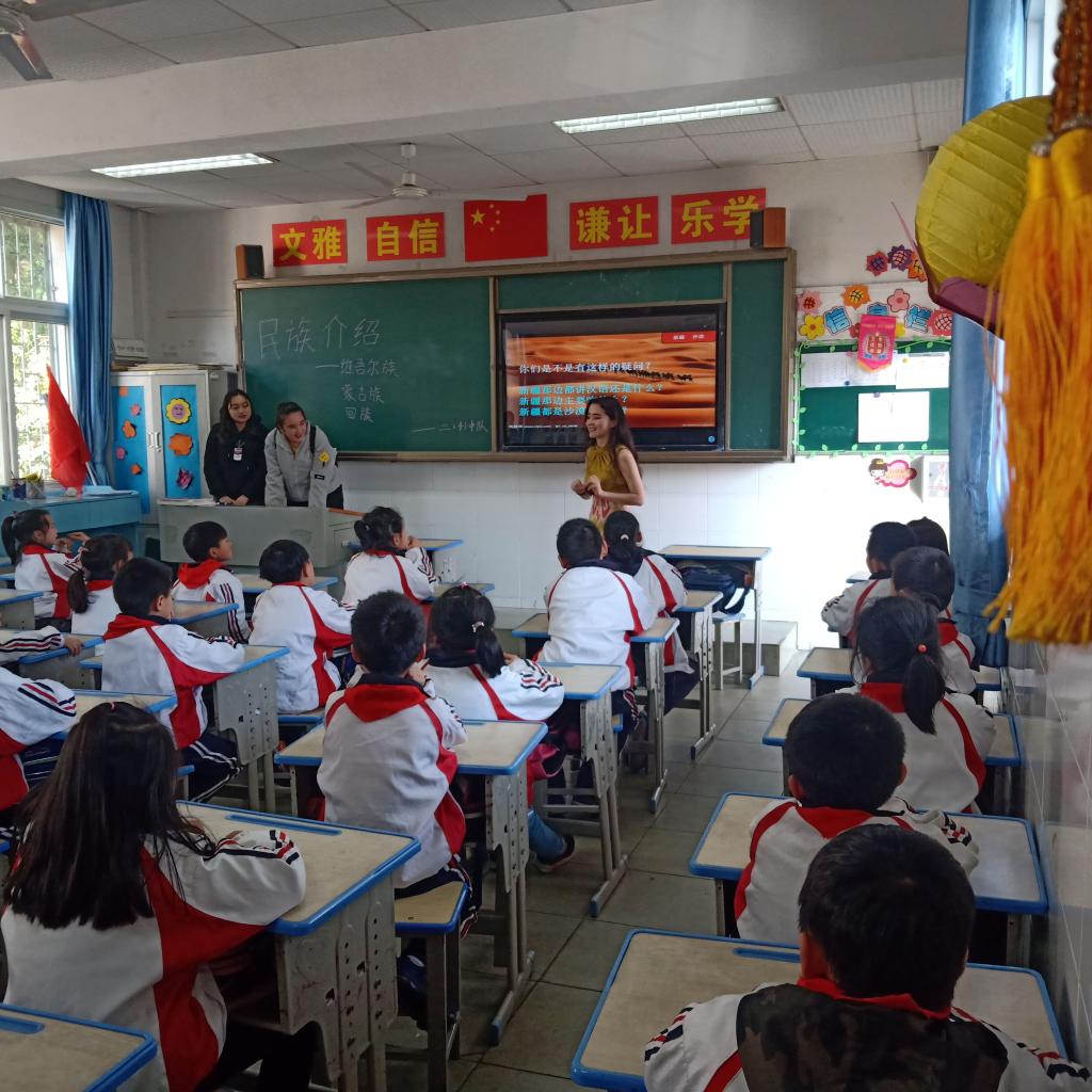 维吾尔族学生菲罗兰·迪里夏提说:小朋友都非常的热情配合,上课过程很有趣,介绍了自己的民族感到很自豪和满足。在小朋友身上看到了自己以前的影子,自己竟然不知不觉已经长大了。希望小朋友们学业顺利,永远像现在一样天真可爱善良。