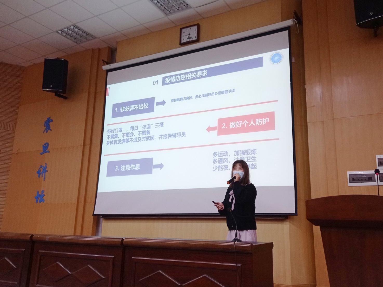 会议的第三项,辅导员黄恬恬老师针对近期的学生安全问题、考勤问题和考风考纪问题等作了强调。她希望同学们树立正确的理想信念,只有把自己的奋斗融入民族、国家的命运之中,才具有人生的价值,她寄语同学们要放眼天下、胸怀祖国,要加强学习、增强本领,勇于扛起中华民族伟大复兴的历史重任。
